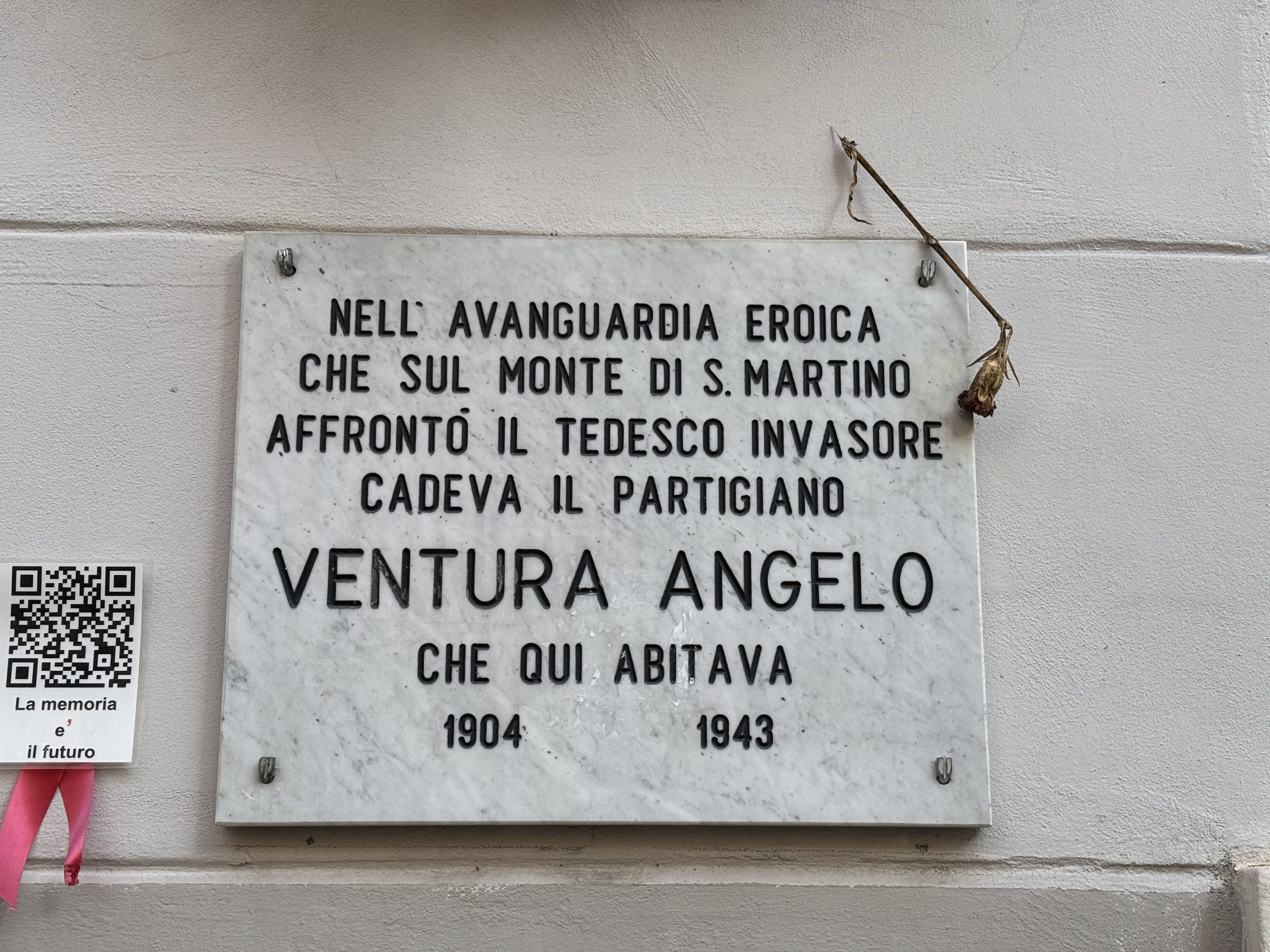 La piccola targa in candido marmo bianco venato di lievi venature, di formato rettangolare, reca incisa la scritta a lettere capitali “NELL’AVANGUARDIA EROICA / CHE SUL MONTE DI S. MARTINO / AFFRONTÒ IL TEDESCO INVASORE / CADEVA IL PARTIGIANO / VENTURA ANGELO / CHE QUI ABITAVA / 1904 1943”.